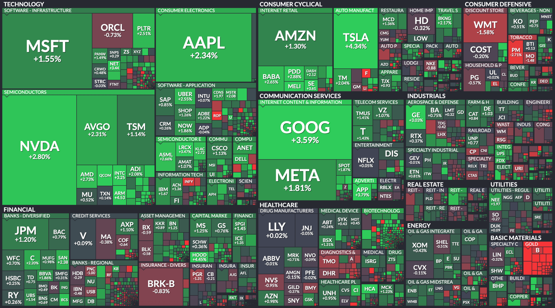 🟩 | US stocks jumped to record highs as US-China tensions cooled and chip gains lifted the S&P and Nasdaq.