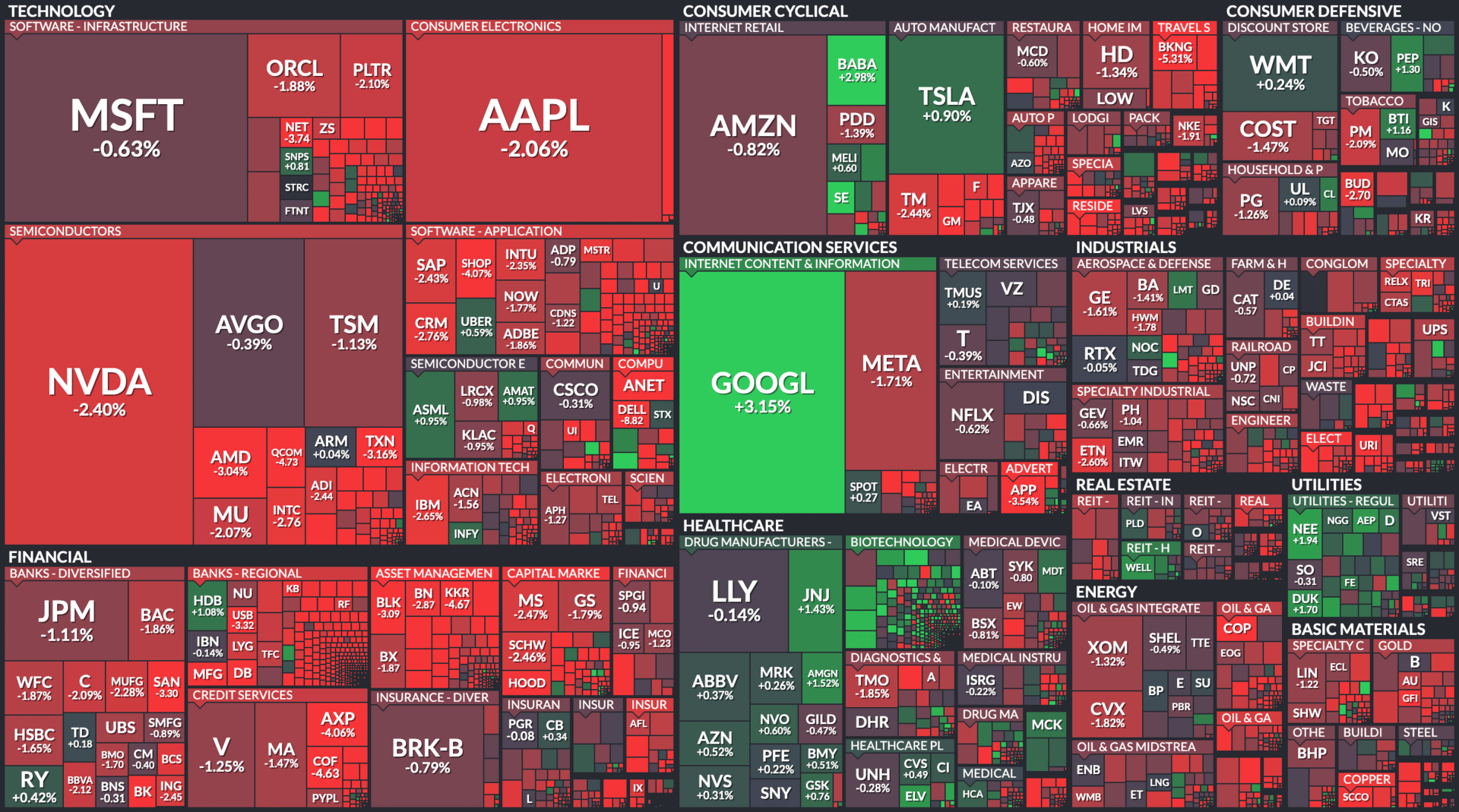 🟥 | US stocks fell today as tech valuation jitters resumed ahead of the aforementioned $4T mega-cap’s quarterly report.