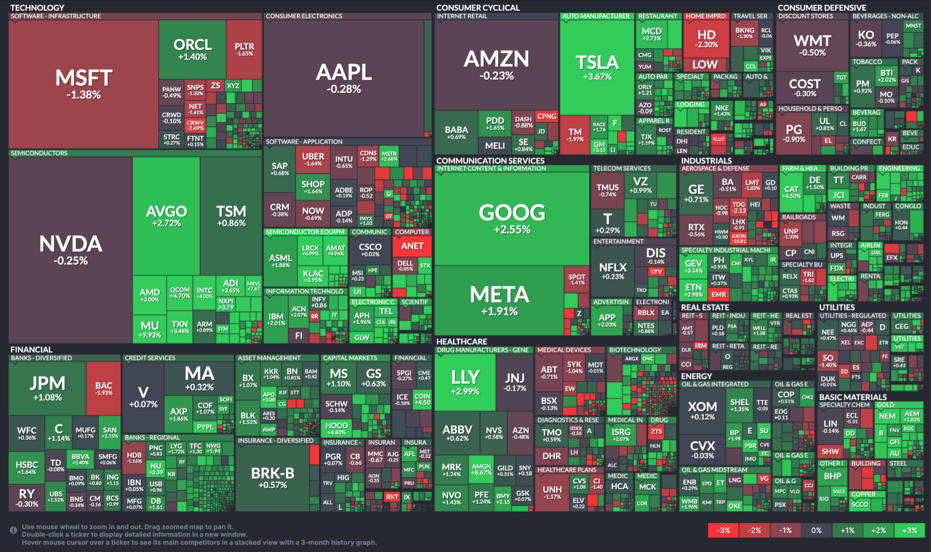 🟩 | US stocks rose as Supreme Court skepticism on tariffs lifted sentiment and AI names rebounded from valuation jitters.
