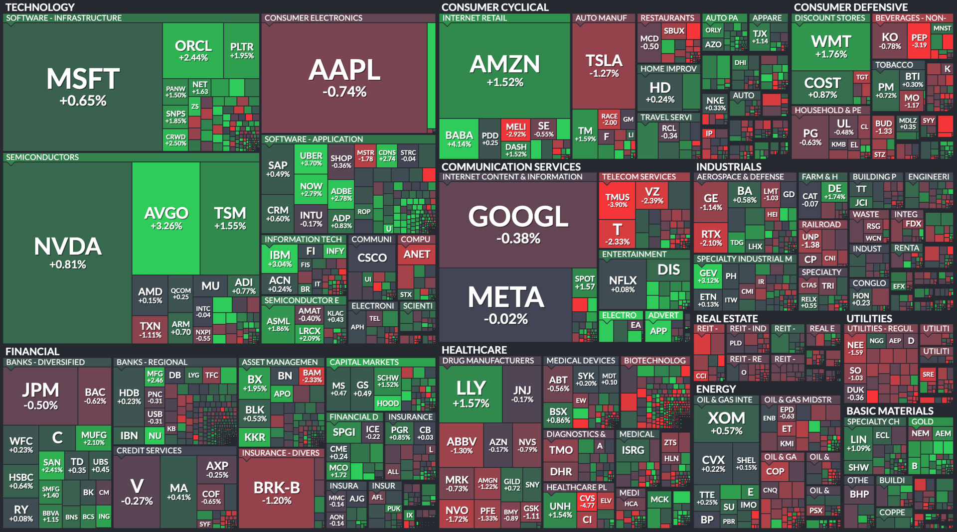 🟩 | US stocks rose today, bringing the Nasdaq Composite to a fresh record high, following a slew of tech news and rate cut optimism.